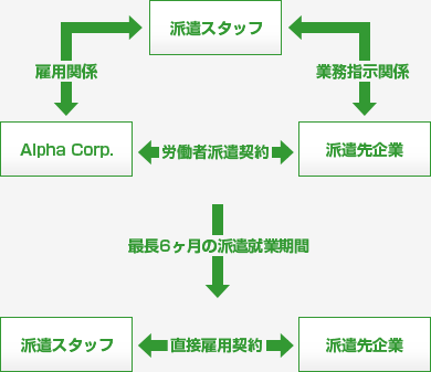 通常の派遣と大きく違うところは、最終的な到達点が、企業と派遣スタッフ双方の同意のもと「正社員もしくは契約社員」として雇用契約に至る、という部分です。